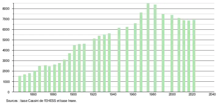 L'évolution du nombre d'habitants est connue à travers les recensements de la population effectués dans la commune depuis 1846. Pour les communes de moins de 10 000 habitants, une enquête de recensement portant sur toute la population est réalisée tous les cinq ans, les populations légales des années intermédiaires étant quant à elles estimées par interpolation ou extrapolation[23]. Pour la commune, le premier recensement exhaustif entrant dans le cadre du nouveau dispositif a été réalisé en 2006[24].