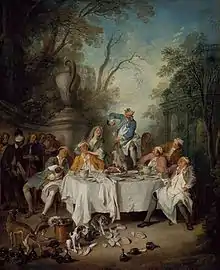 Le peintre Lancret est traditionnellement considéré comme l'inventeur d'un genre pictural : celui de la scène de repas de chasse. Un autre tableau représentant un Repas au retour de la chasse est déjà peint par lui vers 1725 pour le marquis Henri-Camille de Beringhen (musée du Louvre). Il satisfait ainsi la passion du roi Louis XV pour la chasse. Il est d'ailleurs l'un des rares peintre de genre à recevoir des commandes royales régulières[1].