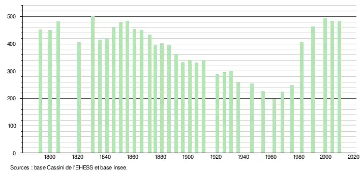 L'évolution du nombre d'habitants est connue à travers les recensements de la population effectués dans la commune depuis 1793. À partir du , les populations légales des communes sont publiées annuellement dans le cadre d'un recensement qui repose désormais sur une collecte d'information annuelle, concernant successivement tous les territoires communaux au cours d'une période de cinq ans. Pour les communes de moins de 10 000 habitants, une enquête de recensement portant sur toute la population est réalisée tous les cinq ans, les populations légales des années intermédiaires étant quant à elles estimées par interpolation ou extrapolation[14]. Pour la commune, le premier recensement exhaustif entrant dans le cadre du nouveau dispositif a été réalisé en 2004[15],[Note 1].