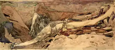 « À côté du salon se trouvait une petite pièce séparée par une arcade. C'est là qu'était posée, de la fenêtre au mur, sur toute la longueur de la pièce, une toile immense. Vroubel, avec une ficelle et du charbon de bois l'a séparée en différents carrés. Il était fort enthousiaste et le manifestait. « Je commence ! » dit-il. »