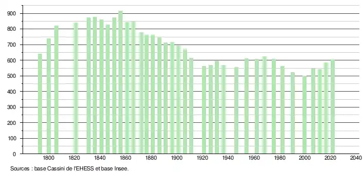 L'évolution du nombre d'habitants est connue à travers les recensements de la population effectués dans la commune depuis 1793. Pour les communes de moins de 10 000 habitants, une enquête de recensement portant sur toute la population est réalisée tous les cinq ans, les populations légales des années intermédiaires étant quant à elles estimées par interpolation ou extrapolation[24]. Pour la commune, le premier recensement exhaustif entrant dans le cadre du nouveau dispositif a été réalisé en 2006[25].