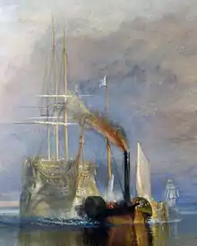 La composition de cette peinture est inhabituelle : l'objet le plus important, le vieux navire de guerre, est placé à la gauche du tableau, où il se présente contre un triangle bleu du ciel et des brumes. La beauté de l'ancien navire est en contraste frappant avec le remorqueur sale et noirci.
