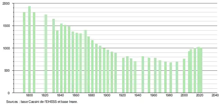 L'évolution du nombre d'habitants est connue à travers les recensements de la population effectués dans la commune depuis 1793. Pour les communes de moins de 10 000 habitants, une enquête de recensement portant sur toute la population est réalisée tous les cinq ans, les populations légales des années intermédiaires étant quant à elles estimées par interpolation ou extrapolation[19]. Pour la commune, le premier recensement exhaustif entrant dans le cadre du nouveau dispositif a été réalisé en 2008[20].