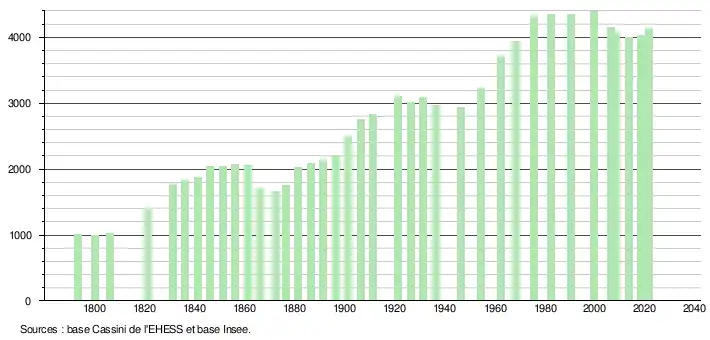 L'évolution du nombre d'habitants est connue à travers les recensements de la population effectués dans la commune depuis 1793. Pour les communes de moins de 10 000 habitants, une enquête de recensement portant sur toute la population est réalisée tous les cinq ans, les populations légales des années intermédiaires étant quant à elles estimées par interpolation ou extrapolation[22]. Pour la commune, le premier recensement exhaustif entrant dans le cadre du nouveau dispositif a été réalisé en 2008[23].