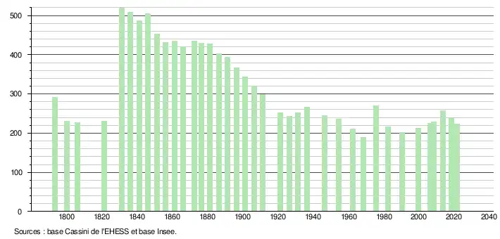 L'évolution du nombre d'habitants est connue à travers les recensements de la population effectués dans la commune depuis 1793. Pour les communes de moins de 10 000 habitants, une enquête de recensement portant sur toute la population est réalisée tous les cinq ans, les populations légales des années intermédiaires étant quant à elles estimées par interpolation ou extrapolation[22]. Pour la commune, le premier recensement exhaustif entrant dans le cadre du nouveau dispositif a été réalisé en 2008[23].