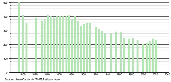| L'évolution du nombre d'habitants est connue à travers les recensements de la population effectués dans la commune depuis 1793. Pour les communes de moins de 10 000 habitants, une enquête de recensement portant sur toute la population est réalisée tous les cinq ans, les populations légales des années intermédiaires étant quant à elles estimées par interpolation ou extrapolation[27]. Pour la commune, le premier recensement exhaustif entrant dans le cadre du nouveau dispositif a été réalisé en 2005[28]. En 2021, la commune comptait 228 habitants[Note 3], en diminution de 5,79 % par rapport à 2015 (Landes : +4,9 %, France hors Mayotte : +1,84 %). |