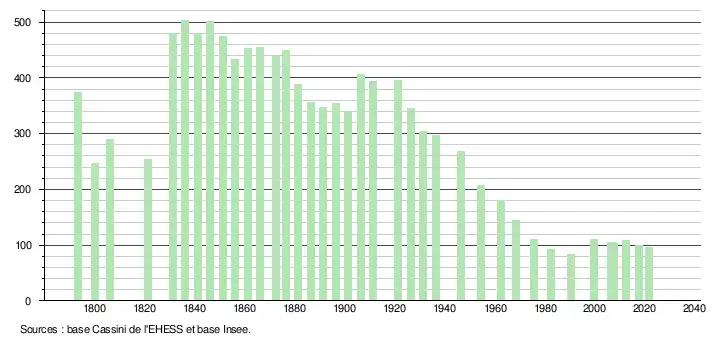 L'évolution du nombre d'habitants est connue à travers les recensements de la population effectués dans la commune depuis 1793. Pour les communes de moins de 10 000 habitants, une enquête de recensement portant sur toute la population est réalisée tous les cinq ans, les populations légales des années intermédiaires étant quant à elles estimées par interpolation ou extrapolation[25]. Pour la commune, le premier recensement exhaustif entrant dans le cadre du nouveau dispositif a été réalisé en 2007[26].