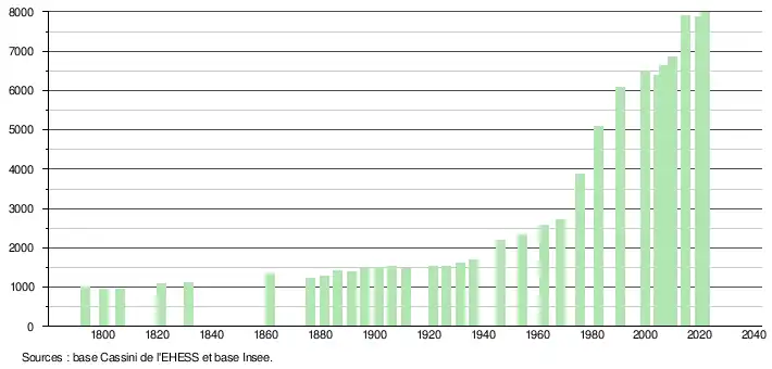 L'évolution du nombre d'habitants est connue à travers les recensements de la population effectués dans la commune depuis 1793. Pour les communes de moins de 10 000 habitants, une enquête de recensement portant sur toute la population est réalisée tous les cinq ans, les populations légales des années intermédiaires étant quant à elles estimées par interpolation ou extrapolation[23]. Pour la commune, le premier recensement exhaustif entrant dans le cadre du nouveau dispositif a été réalisé en 2004[24].