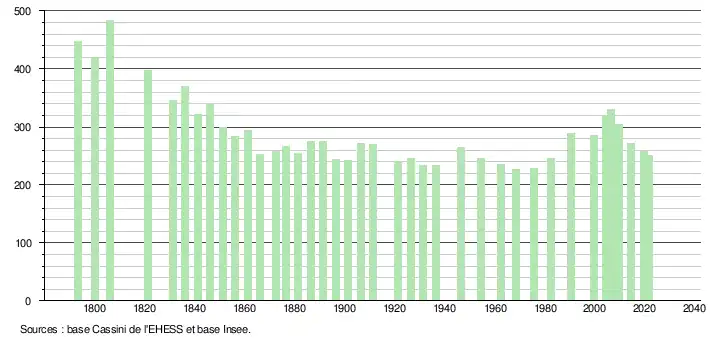 L'évolution du nombre d'habitants est connue à travers les recensements de la population effectués dans la commune depuis 1793. Pour les communes de moins de 10 000 habitants, une enquête de recensement portant sur toute la population est réalisée tous les cinq ans, les populations légales des années intermédiaires étant quant à elles estimées par interpolation ou extrapolation[24]. Pour la commune, le premier recensement exhaustif entrant dans le cadre du nouveau dispositif a été réalisé en 2004[25].