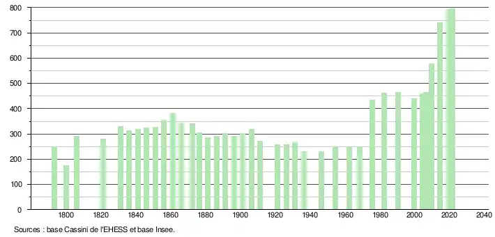 L'évolution du nombre d'habitants est connue à travers les recensements de la population effectués dans la commune depuis 1793. Pour les communes de moins de 10 000 habitants, une enquête de recensement portant sur toute la population est réalisée tous les cinq ans, les populations légales des années intermédiaires étant quant à elles estimées par interpolation ou extrapolation[19]. Pour la commune, le premier recensement exhaustif entrant dans le cadre du nouveau dispositif a été réalisé en 2004[20].