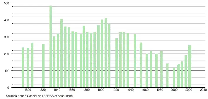 L'évolution du nombre d'habitants est connue à travers les recensements de la population effectués dans la commune depuis 1793. Pour les communes de moins de 10 000 habitants, une enquête de recensement portant sur toute la population est réalisée tous les cinq ans, les populations légales des années intermédiaires étant quant à elles estimées par interpolation ou extrapolation[26]. Pour la commune, le premier recensement exhaustif entrant dans le cadre du nouveau dispositif a été réalisé en 2005[27].