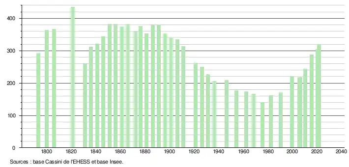 L'évolution du nombre d'habitants est connue à travers les recensements de la population effectués dans la commune depuis 1793. Pour les communes de moins de 10 000 habitants, une enquête de recensement portant sur toute la population est réalisée tous les cinq ans, les populations légales des années intermédiaires étant quant à elles estimées par interpolation ou extrapolation[17]. Pour la commune, le premier recensement exhaustif entrant dans le cadre du nouveau dispositif a été réalisé en 2005[18].
