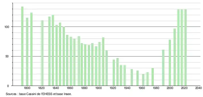 L'évolution du nombre d'habitants est connue à travers les recensements de la population effectués dans la commune depuis 1793. Pour les communes de moins de 10 000 habitants, une enquête de recensement portant sur toute la population est réalisée tous les cinq ans, les populations légales des années intermédiaires étant quant à elles estimées par interpolation ou extrapolation[20]. Pour la commune, le premier recensement exhaustif entrant dans le cadre du nouveau dispositif a été réalisé en 2006[21].