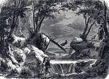 Une lande déserte, s’étendant jusqu’à la mer. Au fond, un ravin, dont un arbre renversé joint les deux bords.