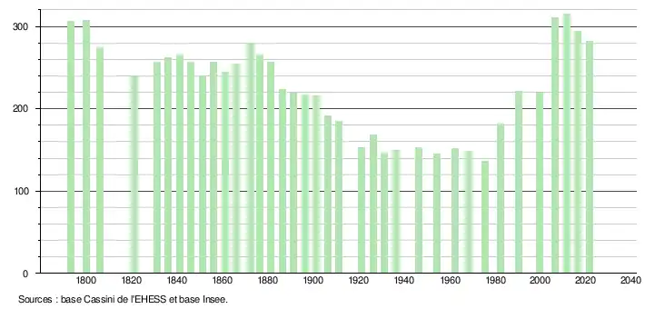 L'évolution du nombre d'habitants est connue à travers les recensements de la population effectués dans la commune depuis 1793. Pour les communes de moins de 10 000 habitants, une enquête de recensement portant sur toute la population est réalisée tous les cinq ans, les populations légales des années intermédiaires étant quant à elles estimées par interpolation ou extrapolation[23]. Pour la commune, le premier recensement exhaustif entrant dans le cadre du nouveau dispositif a été réalisé en 2006[24].
