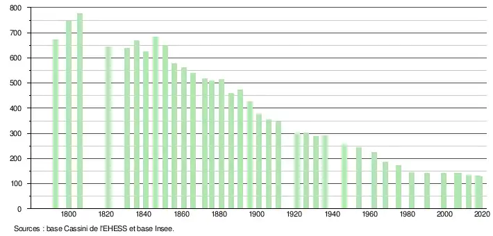 L'évolution du nombre d'habitants est connue à travers les recensements de la population effectués dans la commune depuis 1793. Pour les communes de moins de 10 000 habitants, une enquête de recensement portant sur toute la population est réalisée tous les cinq ans, les populations légales des années intermédiaires étant quant à elles estimées par interpolation ou extrapolation[2]. Pour la commune, le premier recensement exhaustif entrant dans le cadre du nouveau dispositif a été réalisé en 2007[3].
