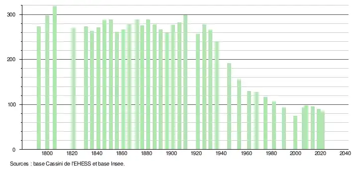 L'évolution du nombre d'habitants est connue à travers les recensements de la population effectués dans la commune depuis 1793. Pour les communes de moins de 10 000 habitants, une enquête de recensement portant sur toute la population est réalisée tous les cinq ans, les populations légales des années intermédiaires étant quant à elles estimées par interpolation ou extrapolation[16]. Pour la commune, le premier recensement exhaustif entrant dans le cadre du nouveau dispositif a été réalisé en 2008[17].