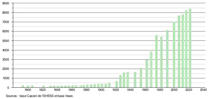 L'évolution du nombre d'habitants est connue à travers les recensements de la population effectués dans la commune depuis 1793. Pour les communes de moins de 10 000 habitants, une enquête de recensement portant sur toute la population est réalisée tous les cinq ans, les populations légales des années intermédiaires étant quant à elles estimées par interpolation ou extrapolation[29]. Pour la commune, le premier recensement exhaustif entrant dans le cadre du nouveau dispositif a été réalisé en 2006[30].