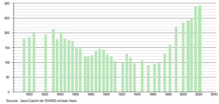 L'évolution du nombre d'habitants est connue à travers les recensements de la population effectués dans la commune depuis 1793. Pour les communes de moins de 10 000 habitants, une enquête de recensement portant sur toute la population est réalisée tous les cinq ans, les populations légales des années intermédiaires étant quant à elles estimées par interpolation ou extrapolation[42]. Pour la commune, le premier recensement exhaustif entrant dans le cadre du nouveau dispositif a été réalisé en 2005[43].