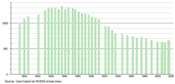 L'évolution du nombre d'habitants est connue à travers les recensements de la population effectués dans la commune depuis 1793. Pour les communes de moins de 10 000 habitants, une enquête de recensement portant sur toute la population est réalisée tous les cinq ans, les populations légales des années intermédiaires étant quant à elles estimées par interpolation ou extrapolation[9]. Pour la commune, le premier recensement exhaustif entrant dans le cadre du nouveau dispositif a été réalisé en 2005[10].