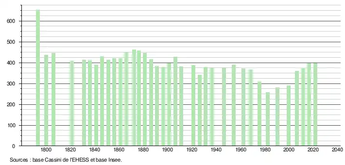 L'évolution du nombre d'habitants est connue à travers les recensements de la population effectués dans la commune depuis 1793. Pour les communes de moins de 10 000 habitants, une enquête de recensement portant sur toute la population est réalisée tous les cinq ans, les populations légales des années intermédiaires étant quant à elles estimées par interpolation ou extrapolation[22]. Pour la commune, le premier recensement exhaustif entrant dans le cadre du nouveau dispositif a été réalisé en 2006[23].