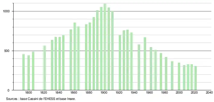 L'évolution du nombre d'habitants est connue à travers les recensements de la population effectués dans la commune depuis 1793. Pour les communes de moins de 10 000 habitants, une enquête de recensement portant sur toute la population est réalisée tous les cinq ans, les populations légales des années intermédiaires étant quant à elles estimées par interpolation ou extrapolation[22]. Pour la commune, le premier recensement exhaustif entrant dans le cadre du nouveau dispositif a été réalisé en 2006[23].