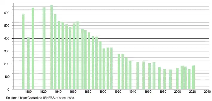 L'évolution du nombre d'habitants est connue à travers les recensements de la population effectués dans la commune depuis 1793. Pour les communes de moins de 10 000 habitants, une enquête de recensement portant sur toute la population est réalisée tous les cinq ans, les populations légales des années intermédiaires étant quant à elles estimées par interpolation ou extrapolation[29]. Pour la commune, le premier recensement exhaustif entrant dans le cadre du nouveau dispositif a été réalisé en 2005[30].