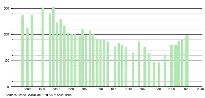 L'évolution du nombre d'habitants est connue à travers les recensements de la population effectués dans la commune depuis 1793. Pour les communes de moins de 10 000 habitants, une enquête de recensement portant sur toute la population est réalisée tous les cinq ans, les populations légales des années intermédiaires étant quant à elles estimées par interpolation ou extrapolation[16]. Pour la commune, le premier recensement exhaustif entrant dans le cadre du nouveau dispositif a été réalisé en 2004[17].