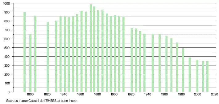 L'évolution du nombre d'habitants est connue à travers les recensements de la population effectués dans la commune depuis 1793. À partir du , les populations légales des communes sont publiées annuellement dans le cadre d'un recensement qui repose désormais sur une collecte d'information annuelle, concernant successivement tous les territoires communaux au cours d'une période de cinq ans. Pour les communes de moins de 10 000 habitants, une enquête de recensement portant sur toute la population est réalisée tous les cinq ans, les populations légales des années intermédiaires étant quant à elles estimées par interpolation ou extrapolation[13]. Pour la commune, le premier recensement exhaustif entrant dans le cadre du nouveau dispositif a été réalisé en 2006[14],[Note 1].