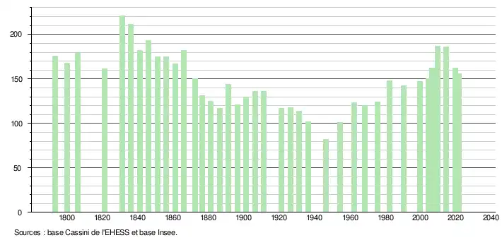 L'évolution du nombre d'habitants est connue à travers les recensements de la population effectués dans la commune depuis 1793. Pour les communes de moins de 10 000 habitants, une enquête de recensement portant sur toute la population est réalisée tous les cinq ans, les populations légales des années intermédiaires étant quant à elles estimées par interpolation ou extrapolation[20]. Pour la commune, le premier recensement exhaustif entrant dans le cadre du nouveau dispositif a été réalisé en 2004[21].