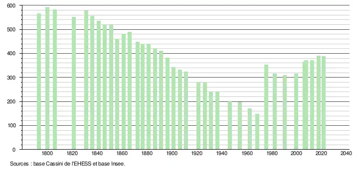 L'évolution du nombre d'habitants est connue à travers les recensements de la population effectués dans la commune depuis 1793. Pour les communes de moins de 10 000 habitants, une enquête de recensement portant sur toute la population est réalisée tous les cinq ans, les populations légales des années intermédiaires étant quant à elles estimées par interpolation ou extrapolation[18]. Pour la commune, le premier recensement exhaustif entrant dans le cadre du nouveau dispositif a été réalisé en 2007[19].