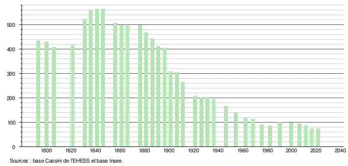 L'évolution du nombre d'habitants est connue à travers les recensements de la population effectués dans la commune depuis 1793. Pour les communes de moins de 10 000 habitants, une enquête de recensement portant sur toute la population est réalisée tous les cinq ans, les populations légales des années intermédiaires étant quant à elles estimées par interpolation ou extrapolation[27]. Pour la commune, le premier recensement exhaustif entrant dans le cadre du nouveau dispositif a été réalisé en 2006[28].