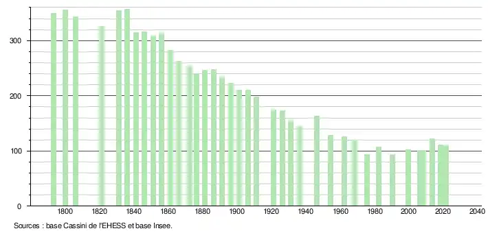 L'évolution du nombre d'habitants est connue à travers les recensements de la population effectués dans la commune depuis 1793. Pour les communes de moins de 10 000 habitants, une enquête de recensement portant sur toute la population est réalisée tous les cinq ans, les populations légales des années intermédiaires étant quant à elles estimées par interpolation ou extrapolation[22]. Pour la commune, le premier recensement exhaustif entrant dans le cadre du nouveau dispositif a été réalisé en 2008[23].