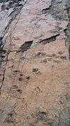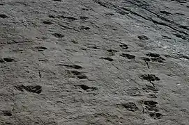 Deux groupes d'empreintes sont initialement décrits : un groupe d'empreinte pentadactyle de type chirotherium (en) de 20 cm de longueur et attribué à l'ichnogenre Isochirotherium[note 1] ; et un groupe plus fréquent d'empreintes tridactyles affiliées aux premiers dinosaures du Trias[5],[8]. Ces empreintes permettaient aux auteurs de proposer un âge Trias moyen à tardif. Une première révision[9] précisa les déterminations des chirotheriums (genres Brachychirolherium et Isochirotherium) et attribua les empreintes tridactyles à des dinosaures ornithischiens dont la plupart étaient décrites comme de nouvelles ichnoespèces des genres Paratrisauropus, Deuterosuaropodus et Pachysaurichium. Ces déterminations permettaient aux auteurs de préciser l'âge Ladinien à Carnien. Néanmoins ces interprétations ont par la suite été remis en cause et toutes les empreintes sont maintenant attribuées à des chirotheriums[10],[11], des reptiles mesurant entre deux et quatre mètres de haut et pesant moins de 500 kg.