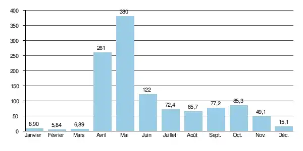 Le débit moyen mensuel observé en février (minimum d'étiage) est de 5,84 m3/s, soit à peine 1,5 % du débit moyen du mois de mai (380 m3/s), ce qui témoigne de l'amplitude extrêmement importante des variations saisonnières. Sur la durée d'observation de 50 ans, le débit mensuel minimal a été de 2,16 m3/s en , tandis que le débit mensuel maximal s'élevait à 885 m3/s en .