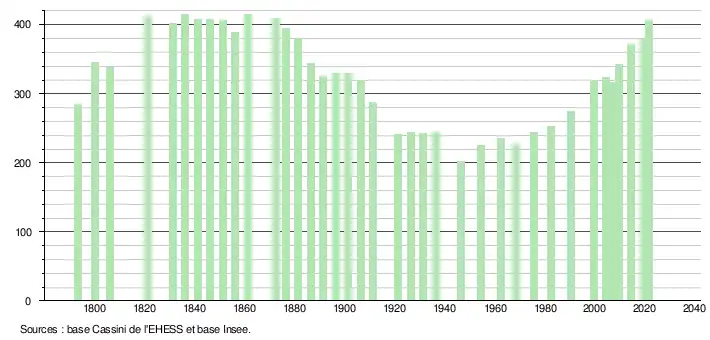 L'évolution du nombre d'habitants est connue à travers les recensements de la population effectués dans la commune depuis 1793. Pour les communes de moins de 10 000 habitants, une enquête de recensement portant sur toute la population est réalisée tous les cinq ans, les populations légales des années intermédiaires étant quant à elles estimées par interpolation ou extrapolation[16]. Pour la commune, le premier recensement exhaustif entrant dans le cadre du nouveau dispositif a été réalisé en 2004[17].
