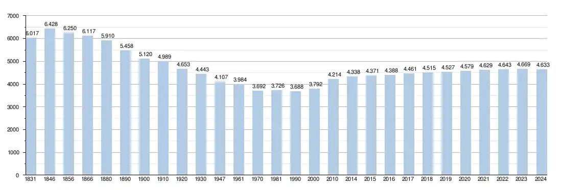 Elle comptait, au , 4 624 habitants (2 240 hommes et 2 384 femmes) [5], soit une densité de 92,80 habitants/km² pour une superficie de 49,83 km²[2].