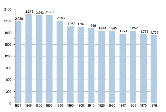Les chiffres des années 1831 à 1970 tiennent compte des chiffres des anciennes communes fusionnées.