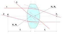 et étant les sommets des faces d'entrée et de sortie de la lentille, la position des points principaux et sont définies par[1] :