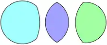 L'aire d'une lentille asymétrique s'exprime en fonction des rayons R et r et de la distance entre les centres d[1]: