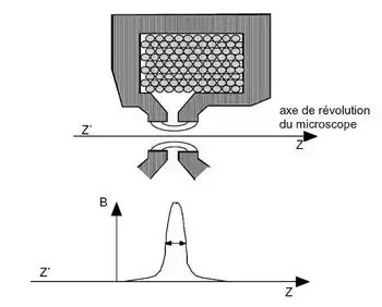 Une lentille magnétique est un dispositif produisant un champ magnétique à symétrie de révolution, utilisé dans des appareils comme les microscopes électroniques pour focaliser les faisceaux d'électrons de la même façon que les lentilles en verre sont utilisées dans les appareils d'optique photonique.