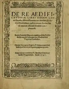 - De re aedificatoria (L'Art d'édifier), traité d'architecture commencé en 1449 imprimé en 1485 à Florence[12], puis en 1512 à Paris et 1541 à Strasbourg. Il a été traduit en français par Jean Martin en 1553 sous le titre L’Architecture et Art de bien bastir[13]. Il a également été traduit en espagnol et portugais au XVIe siècle, puis en anglais au XVIIIe siècle, et en allemand, russe, japonais, etc. au XXe siècle.