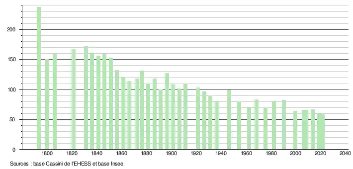 L'évolution du nombre d'habitants est connue à travers les recensements de la population effectués dans la commune depuis 1793. Pour les communes de moins de 10 000 habitants, une enquête de recensement portant sur toute la population est réalisée tous les cinq ans, les populations légales des années intermédiaires étant quant à elles estimées par interpolation ou extrapolation[16]. Pour la commune, le premier recensement exhaustif entrant dans le cadre du nouveau dispositif a été réalisé en 2008[17].