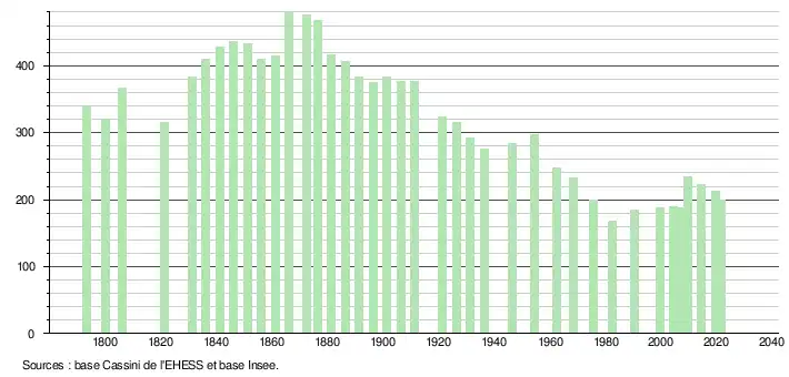 L'évolution du nombre d'habitants est connue à travers les recensements de la population effectués dans la commune depuis 1793. Pour les communes de moins de 10 000 habitants, une enquête de recensement portant sur toute la population est réalisée tous les cinq ans, les populations légales des années intermédiaires étant quant à elles estimées par interpolation ou extrapolation[22]. Pour la commune, le premier recensement exhaustif entrant dans le cadre du nouveau dispositif a été réalisé en 2004[23].