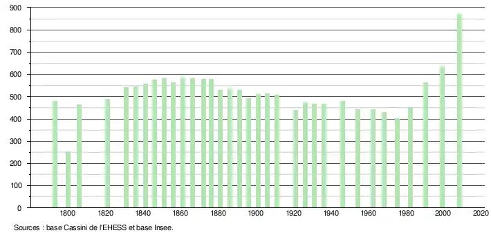 L'évolution du nombre d'habitants est connue à travers les recensements de la population effectués dans la commune depuis 1793. À partir du , les populations légales des communes sont publiées annuellement dans le cadre d'un recensement qui repose désormais sur une collecte d'information annuelle, concernant successivement tous les territoires communaux au cours d'une période de cinq ans. Pour les communes de moins de 10 000 habitants, une enquête de recensement portant sur toute la population est réalisée tous les cinq ans, les populations légales des années intermédiaires étant quant à elles estimées par interpolation ou extrapolation[14]. Pour la commune, le premier recensement exhaustif entrant dans le cadre du nouveau dispositif a été réalisé en 2008[15],[Note 1].