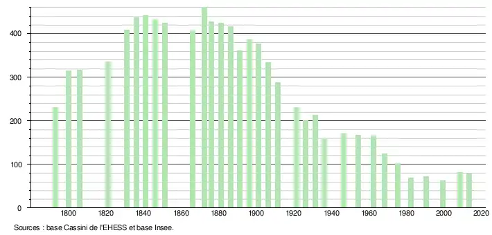 L'évolution du nombre d'habitants est connue à travers les recensements de la population effectués dans la commune depuis 1793. À partir du , les populations légales des communes sont publiées annuellement dans le cadre d'un recensement qui repose désormais sur une collecte d'information annuelle, concernant successivement tous les territoires communaux au cours d'une période de cinq ans. Pour les communes de moins de 10 000 habitants, une enquête de recensement portant sur toute la population est réalisée tous les cinq ans, les populations légales des années intermédiaires étant quant à elles estimées par interpolation ou extrapolation[5]. Pour la commune, le premier recensement exhaustif entrant dans le cadre du nouveau dispositif a été réalisé en 2008[6],[Note 1].