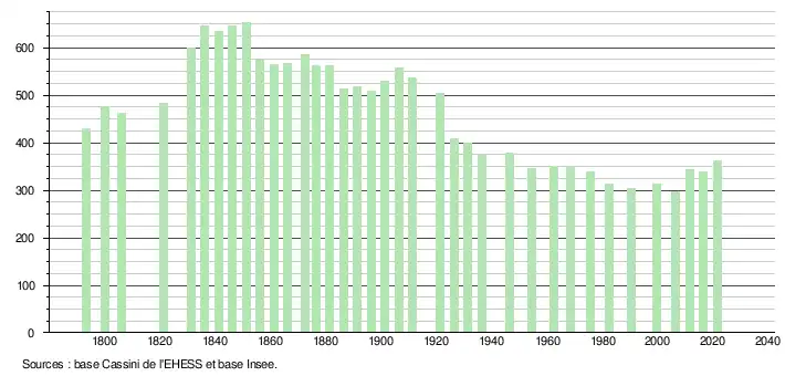 L'évolution du nombre d'habitants est connue à travers les recensements de la population effectués dans la commune depuis 1793. Pour les communes de moins de 10 000 habitants, une enquête de recensement portant sur toute la population est réalisée tous les cinq ans, les populations légales des années intermédiaires étant quant à elles estimées par interpolation ou extrapolation[30]. Pour la commune, le premier recensement exhaustif entrant dans le cadre du nouveau dispositif a été réalisé en 2006[31].