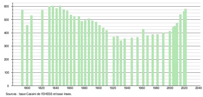 L'évolution du nombre d'habitants est connue à travers les recensements de la population effectués dans la commune depuis 1793. Pour les communes de moins de 10 000 habitants, une enquête de recensement portant sur toute la population est réalisée tous les cinq ans, les populations légales des années intermédiaires étant quant à elles estimées par interpolation ou extrapolation[37]. Pour la commune, le premier recensement exhaustif entrant dans le cadre du nouveau dispositif a été réalisé en 2004[38].