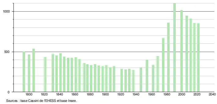 L'évolution du nombre d'habitants est connue à travers les recensements de la population effectués dans la commune depuis 1793. Pour les communes de moins de 10 000 habitants, une enquête de recensement portant sur toute la population est réalisée tous les cinq ans, les populations légales des années intermédiaires étant quant à elles estimées par interpolation ou extrapolation[21]. Pour la commune, le premier recensement exhaustif entrant dans le cadre du nouveau dispositif a été réalisé en 2006[22].