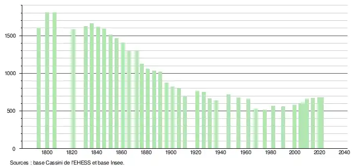 L'évolution du nombre d'habitants est connue à travers les recensements de la population effectués dans la commune depuis 1793. Pour les communes de moins de 10 000 habitants, une enquête de recensement portant sur toute la population est réalisée tous les cinq ans, les populations légales des années intermédiaires étant quant à elles estimées par interpolation ou extrapolation[22]. Pour la commune, le premier recensement exhaustif entrant dans le cadre du nouveau dispositif a été réalisé en 2004[23].